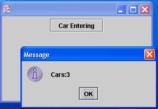 import java.awt.*; import java.awt.event.*; import javax.swing.*; public class CarCounter extends JFrame implements ActionListener { private int carCount = 0; private JButton button; public static void main(String[] args) { CarCounter frame = new CarCounter(); frame.setSize(300, 200); frame.createGUI(); frame.show(); } private void createGUI() { setDefaultCloseOperation(EXIT_ON_CLOSE); Container window = getContentPane(); window.setLayout(new FlowLayout()); button = new JButton("Car Entering"); window.add(button); button.addActionListener(this); } public void actionPerformed(ActionEvent event) { carCount = carCount + 1; JOptionPane.showMessageDialog(null, "Cars:" + carCount); } }Do not be tempted to amend the user-interface code for now. It must be exactly as shown.
