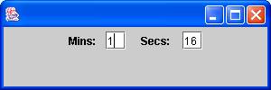 import java.awt.*; import java.awt.event.*; import javax.swing.*; public class TimerExample extends JFrame implements ActionListener { private JTextField secsField, minsField; private JLabel secsLabel, minsLabel; private int ticks = 0; private Timer timer; public static void main (String[] args) { TimerExample frame = new TimerExample(); frame.setSize(300,100); frame.createGUI(); frame.show(); } private void createGUI() { setDefaultCloseOperation(EXIT_ON_CLOSE); Container window = getContentPane(); window.setLayout(new FlowLayout() ); minsLabel = new JLabel("Mins: "); window.add(minsLabel); minsField = new JTextField(2); window.add(minsField); secsLabel = new JLabel(" Secs: "); window.add(secsLabel); secsField = new JTextField(2); window.add(secsField); timer = new Timer(1000, this); timer.start(); } public void actionPerformed(ActionEvent event) { minsField.setText(Integer.toString(ticks / 60)); secsField.setText(Integer.toString(ticks % 60)); ticks = ticks + 1; } }