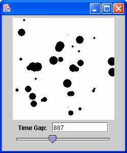 import java.awt.*; import java.awt.event.*; import javax.swing.*; import javax.swing.event.*; import java.util.*; public class Raindrops extends JFrame implements ActionListener, ChangeListener { private JPanel panel; private Random random; private javax.swing.Timer timer; private JSlider slider; private JTextField gapField; private JLabel gapLabel; public static void main (String[] args) { Raindrops frame = new Raindrops(); frame.setSize(250, 300); frame.createGUI(); frame.show(); } private void createGUI() { setDefaultCloseOperation(EXIT_ON_CLOSE); Container window = getContentPane(); window.setLayout(new FlowLayout() ); random = new Random(); panel = new JPanel(); panel.setPreferredSize(new Dimension(200, 200)); panel.setBackground(Color.white); window.add(panel); gapLabel = new JLabel("Time Gap: "); window.add(gapLabel); gapField = new JTextField(10); window.add(gapField); slider = new JSlider(JSlider.HORIZONTAL, 200, 2000, 1000); window.add(slider); slider.addChangeListener(this); gapField.setText(Integer.toString(slider.getValue())); timer = new javax.swing.Timer(1000, this); timer.start(); } public void actionPerformed(ActionEvent event) { int x, y, size; Graphics paper = panel.getGraphics(); x=random.nextInt(200); y = random.nextInt(200); size = random.nextInt(20); paper.fillOval(x,y, size, size); } public void stateChanged(ChangeEvent e) { int timeGap = slider.getValue(); gapField.setText(Integer.toString(timeGap)); timer.setDelay(timeGap); } }